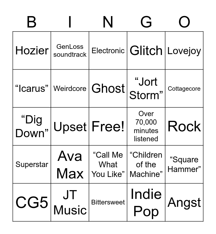 This bingo card has a free space and 24 words: Ava Max, JT Music, Ghost, CG5, Lovejoy, Hozier, “Icarus”, GenLoss soundtrack, Over 70,000 minutes listened, “Call Me What You Like”, “Jort Storm”, “Dig Down”, “Children of the Machine”, “Square Hammer”, Weirdcore, Indie Pop, Rock, Electronic, Cottagecore, Upset, Angst, Superstar, Glitch and Bittersweet.