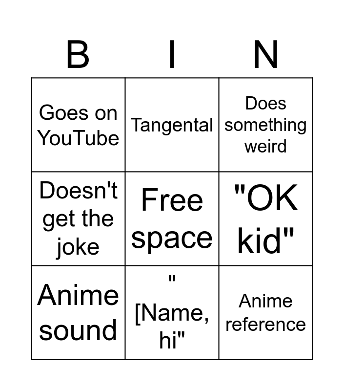 This bingo card has a free space and 11 words: Says name and doesn't add anything, "[Name, hi", Anime reference, Anime sound, Tangental, Does something weird, "OK kid", Insight?, Doesn't get the joke, Goes on YouTube and Surprised, somehow.