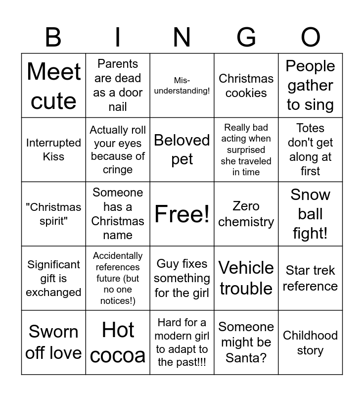 This bingo card has a free space and 28 words: Star trek reference, The Ryker move, Really bad acting when surprised she traveled in time, Someone might be Santa?, Interrupted Kiss, Mis- understanding!, Parents are dead as a door nail, Significant gift is exchanged, Zero chemistry, Sworn off love, "Christmas spirit", Christmas cookies, Hot cocoa, Hard for a modern girl to adapt to the past!!!, Totes don't get along at first, Perfect well-behaved child, Accidentally references future (but no one notices!), Actually roll your eyes because of cringe, Beloved pet, Guy fixes something for the girl, Meet cute, Someone chases someone to stop them from leaving, Childhood story, Someone has a Christmas name, Snow ball fight!, Vehicle trouble, People gather to sing and Help decorate for event.