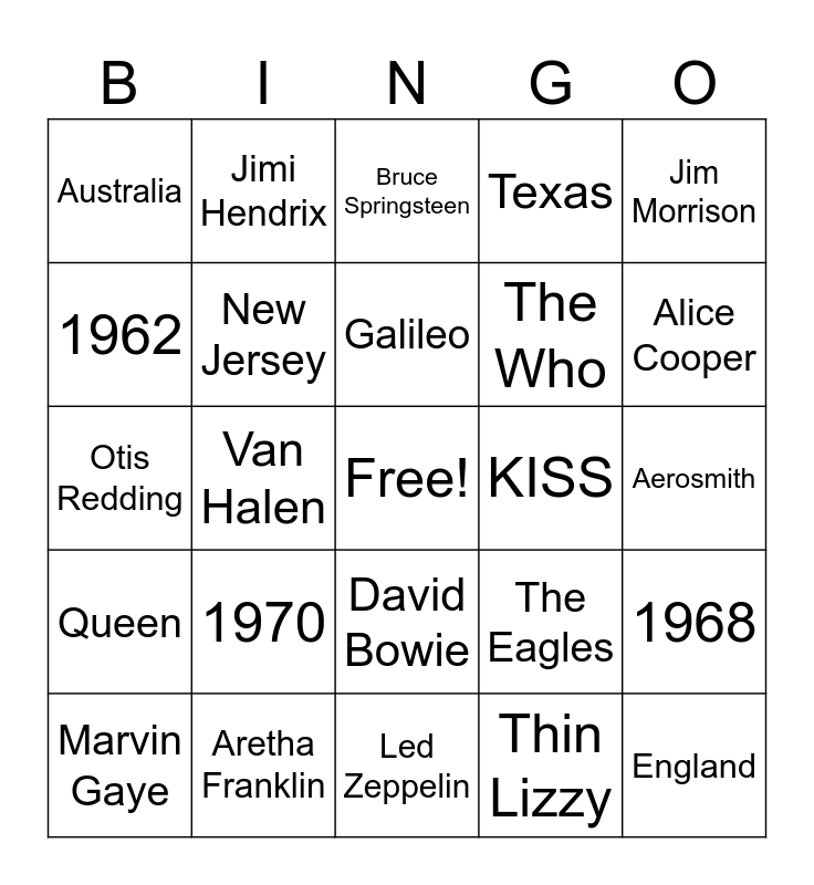 This bingo card has a free space and 24 words: 1970, Aretha Franklin, Galileo, Marvin Gaye, Jim Morrison, Australia, 1962, Jimi Hendrix, KISS, David Bowie, The Who, Otis Redding, The Eagles, 1968, New Jersey, Thin Lizzy, Aerosmith, Bruce Springsteen, Alice Cooper, Van Halen, England, Queen, Texas and Led Zeppelin.