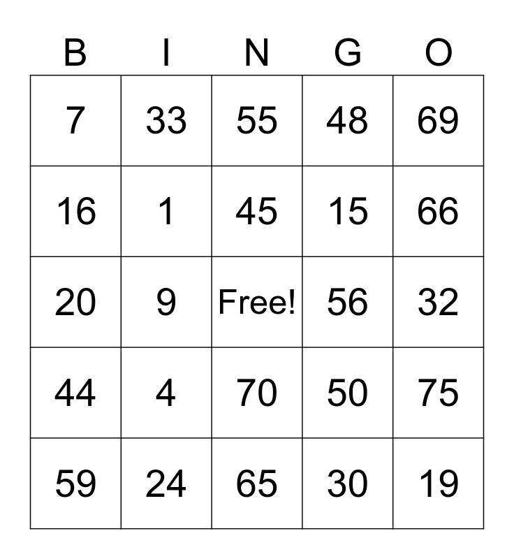This bingo card has a free space and 24 words: 4, 24, 45, 59, 69, 7, 16, 33, 56, 70, 15, 20, 50, 75, 1, 30, 32, 55, 66, 9, 19, 44, 48 and 65.
