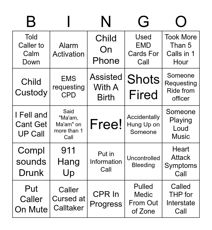 This bingo card has a free space and 24 words: 911 Hang Up, Caller Cursed at Calltaker, Assisted With A Birth, Put Caller On Mute, Took More Than 5 Calls in 1 Hour, Told Caller to Calm Down, Child Custody, Alarm Activation, Accidentally Hung Up on Someone, Put in Information Call, Shots Fired, I Fell and Cant Get UP Call, Uncontrolled Bleeding, Heart Attack Symptoms Call, EMS requesting CPD, Pulled Medic From Out of Zone, Someone Playing Loud Music, Child On Phone, Someone Requesting Ride from officer, Said "Ma'am, Ma'am" on more than 1 Call, Called THP for Interstate Call, Compl sounds Drunk, Used EMD Cards For Call and CPR In Progress.