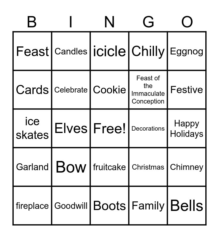 This bingo card has a free space and 49 words: Angel, Bells, Blizzard, Boots, Bow, box, Candles, candy cane, Cards, Caroling, Celebrate, Chilly, Chimney, Christmas, Cider, Cold, Cookie, Decorations, Dreidel, Eggnog, Elves, Family, Feast, Feast of the Immaculate Conception, Feliz Navidad, Festive, fireplace, Frosty the Snowman, fruitcake, Garland, Gelt, Gift-giving, Gingerbread, Giving, Goodwill, Ham, Hanukkah, Happy Hanukkah, Happy Holidays, Holly, Hope, hot chocolate, hot cider, hugs, ice skates, icicle, Jack Frost, jingle bells and Jolly.