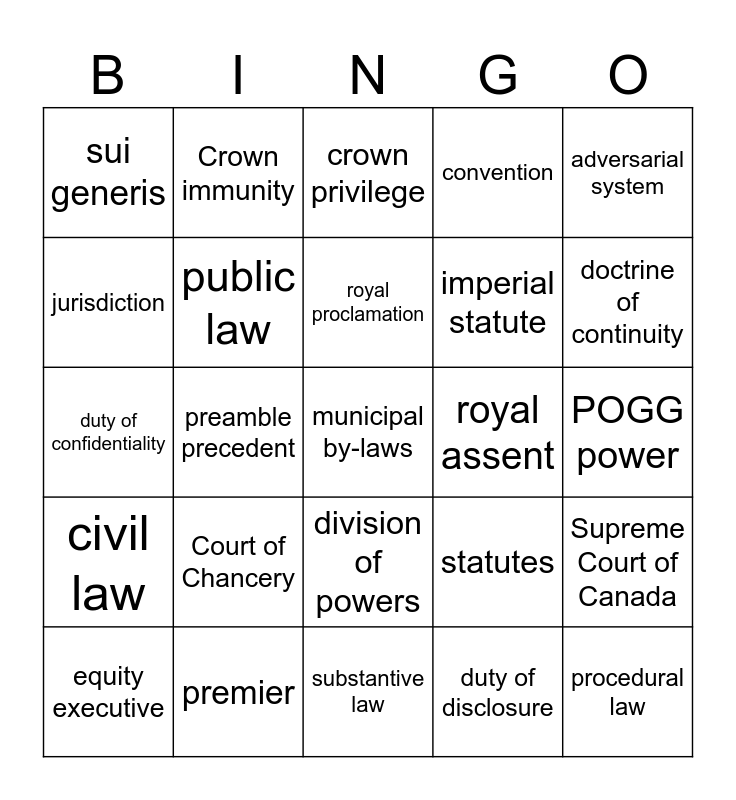This bingo card has 102 words: aboriginal law, aboriginal title, adversarial system, affirmative action, appellant, benchers, bicameral, bijural, bill, binding, called to the bar, case brief, cession, chancery, chapter number, civil code, civil law, civil liberties, civil wrong, codes of conduct, commencement section, cones of silence, Confederation, constitutional law, constitutionally entrenched, doctrine of continuity, convention, Court of Chancery, Court of Kings(Queens) Bench, Crown, Crown immunity, crown privilege, definition section, delegates non detest delegare, doctrine of discovery, division of powers, double-aspect law, duty of competence, duty of confidentiality, duty of disclosure, duty of loyalty, enabling section, equity executive, federalism, federal paramountcy doctrine, governor general, headnote, imperial statute, indigenous law, inferior court, intervenor, judicial independence, jurisdiction, law society, legal aid, legislation, legislative intent, legislature, lieutenant governor, municipal by-laws, negotiable instrument, neutral citation, open court principle, parliamentary sovereignty, patriate, persuasive, plaintiff, POGG power, preamble precedent, premier, prime minister, pro bono, procedural law, proclamation, prorogue, public bill, public law, cuisine, reading, reference, regulations, reserve, revised statutes, royal assent, royal prerogative, royal proclamation, rule of law, seciton, serration of powers doctrine, short title, stare decisis, statutes, statutory interpretation, style of cause, subordinate legislation, substantive law, sui generis, supremacy clause, Supreme Court of Canada, undertaking, unicameral and writ.
