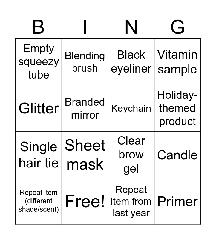 This bingo card has 22 words: Free!, Red lipstick, Blending brush, Stickers, Branded mirror, Keychain, Empty squeezy tube, Black eyeliner, Clear brow gel, Primer, Single hair tie, Vitamin sample, Setting spray, Clear lip gloss, Repeat item from last year, Shampoo / conditioner (Separate doors), Candle, Repeat item (different shade/scent), Sheet mask, Glitter, Holiday-themed product and Cult-favorite product.