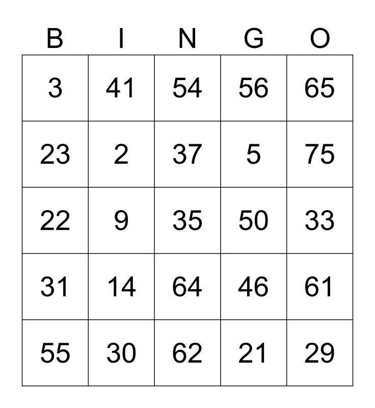 This bingo card has a free space and 24 words: 14, 30, 37, 55, 65, 3, 23, 41, 50, 64, 5, 22, 46, 61, 2, 21, 33, 54, 75, 9, 29, 31, 56 and 62.
