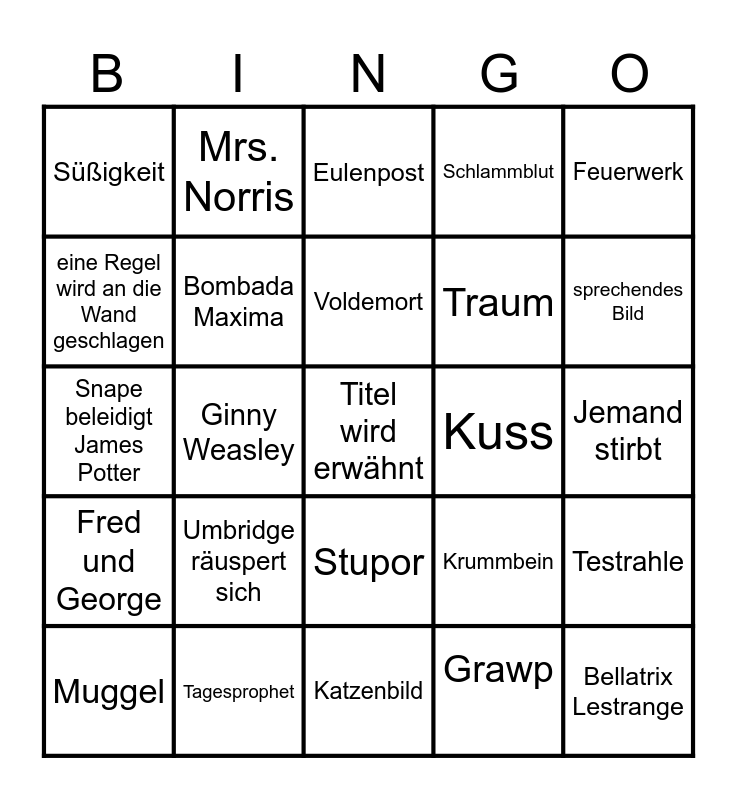This bingo card has 25 words: Umbridge räuspert sich, Katzenbild, Voldemort, Muggel, Feuerwerk, Süßigkeit, eine Regel wird an die Wand geschlagen, Mrs. Norris, Kuss, Stupor, Traum, Snape beleidigt James Potter, Krummbein, Testrahle, Bombada Maxima, Bellatrix Lestrange, Jemand stirbt, Eulenpost, sprechendes Bild, Ginny Weasley, Titel wird erwähnt, Tagesprophet, Fred und George, Schlammblut and Grawp.