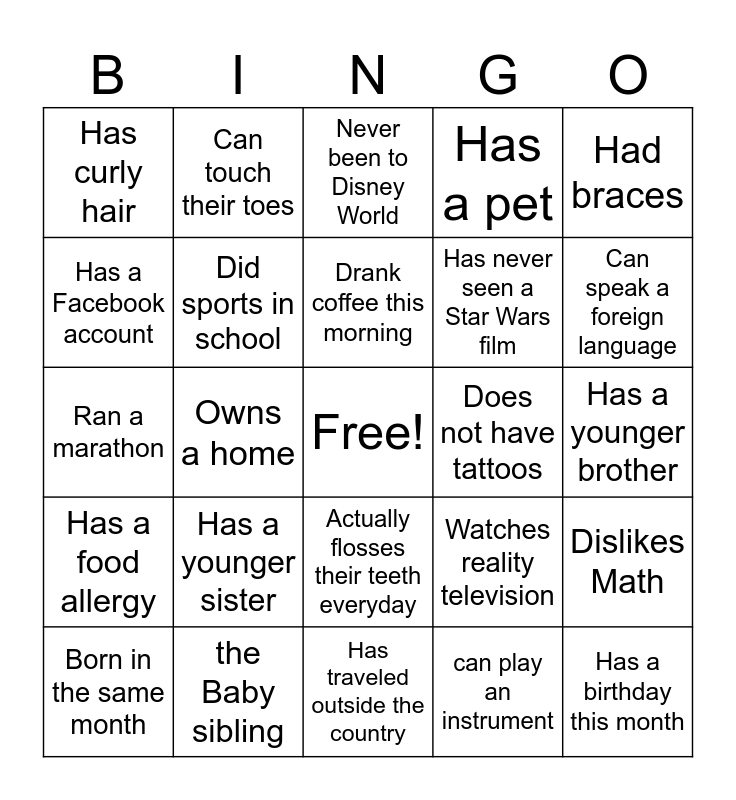 This bingo card has a free space and 29 words: Born in the same month, First name has 7+ letters, Owns a home, Wears the same shoe size, Has curly hair, Never been to Disney World, Did sports in school, Has a younger sister, Does not have tattoos, the Baby sibling, Has a younger brother, Has a birthday this month, Has traveled outside the country, can play an instrument, Can speak a foreign language, Is a lefty, Actually flosses their teeth everyday, Has a food allergy, Had braces, Ran a marathon, Watches reality television, Loves to sing Karaoke, Has never seen a Star Wars film, Has a Facebook account, Has a pet, Can touch their toes, Dislikes Math, Drank coffee this morning and Has a cat..