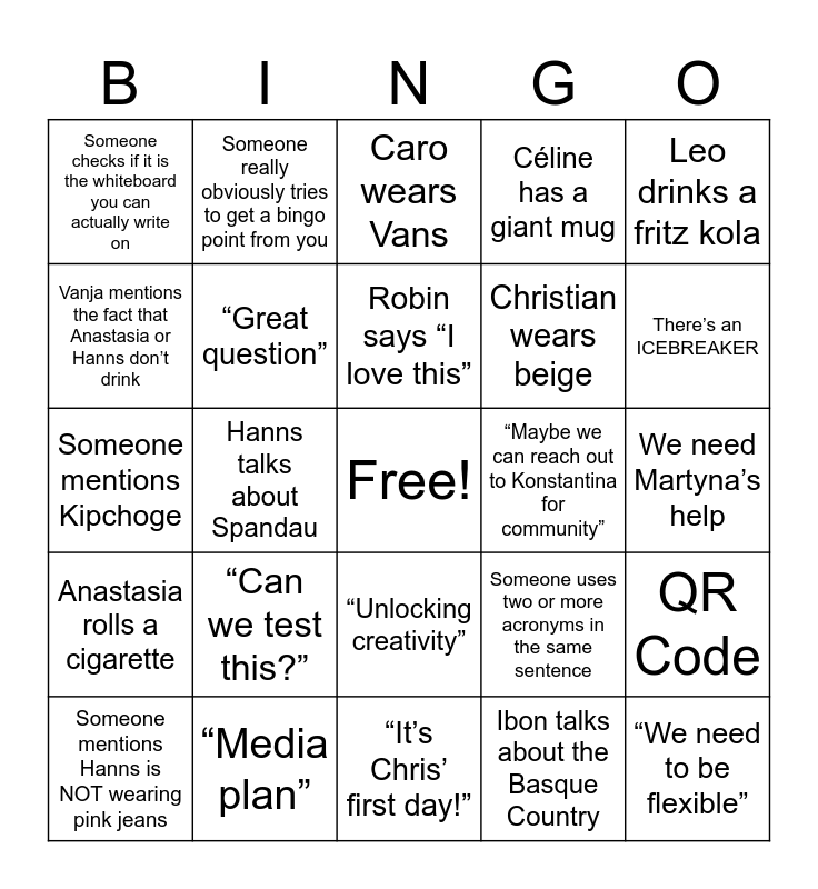 This bingo card has a free space and 40 words: Storming — Forming — Norming, Someone mentions Kipchoge, “Full Funnel”, “Great question”, “Media plan”, “Unlocking creativity”, Robin says “I love this”, Someone talks about Alex’s hair, Leo drinks a fritz kola, Anastasia rolls a cigarette, Hanns talks about Spandau, Céline has a giant mug, “We need to be flexible”, We need Martyna’s help, “Maybe we can reach out to Konstantina for community”, “Can we test this?”, The host leaves the meeting early and closes it for everyone, Someone checks if it is the whiteboard you can actually write on, “Two things”, Caro wears Vans, QR Code, Ibon talks about the Basque Country, Christian wears beige, Vanja mentions the fact that Anastasia or Hanns don’t drink, Sable mentions Peepers was a show cat, Hélo wears funky earrings, Someone jokes about the restaurant name, “Who’s calling an Uber?”, Someone has a sticker with our racist bird, Someone forgot their badge, “Which room are we in?”, Someone mentions Hanns is NOT wearing pink jeans, Someone explains an acronym, Someone uses two or more acronyms in the same sentence, There’s an ICEBREAKER, “It’s Chris’ first day!”, Someone mentions Anastasia is French, Michelle talks about German/Berlin Christmas markets, Someone really obviously tries to get a bingo point from you and There are donuts in the office.