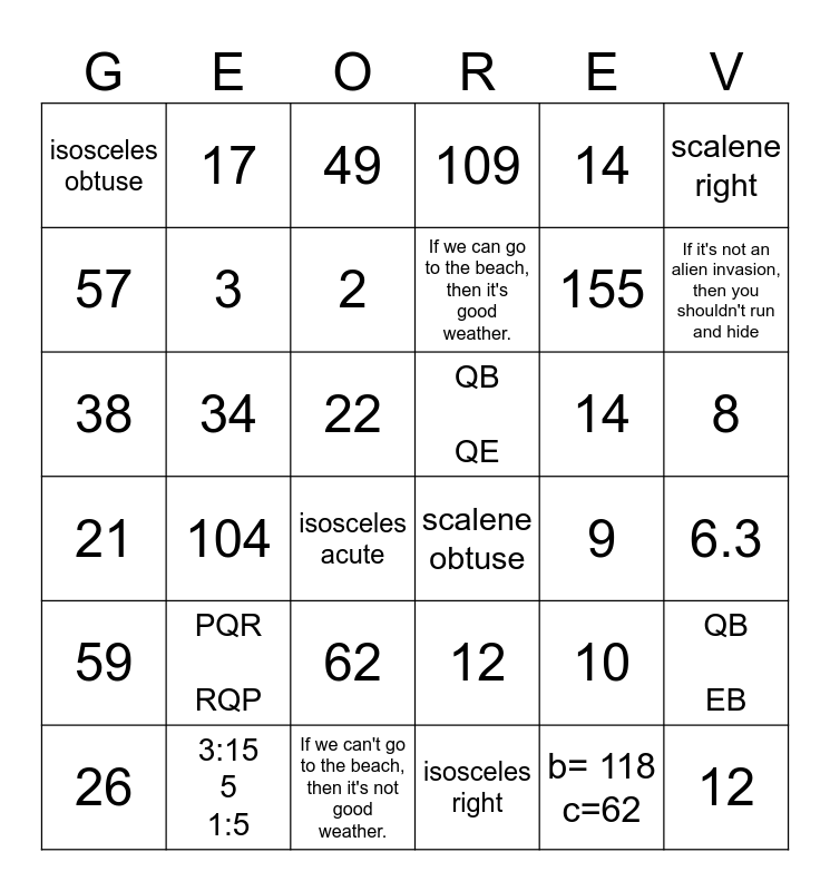 This bingo card has 54 words: AH HA, QB QE, BX XW, PQR RQP, 8, 12, 109, 30, scalene right, equilateral, isosceles obtuse, isosceles right, scalene obtuse, isosceles acute, scalene acute, 9, 38, 2, Free!, 22, 21, 62, 34, 14, 38, 17, 26, 10.3, 12, 6.3, If the temp isn't in the 70s, then its not a nice day., If we can't go to the beach, then it's not good weather., If you should run and hide, then it's an alien invasion., 61, 49, b= 118 c=62, 155, 104, 59, 57, 40, 144, 105, 4, 14, 12, 3:15 5 1:5, 10, 3, If it's not an alien invasion, then you shouldn't run and hide, If we can go to the beach, then it's good weather., If it's a nice day, then the temp is in the 70's., QB EB and 108.
