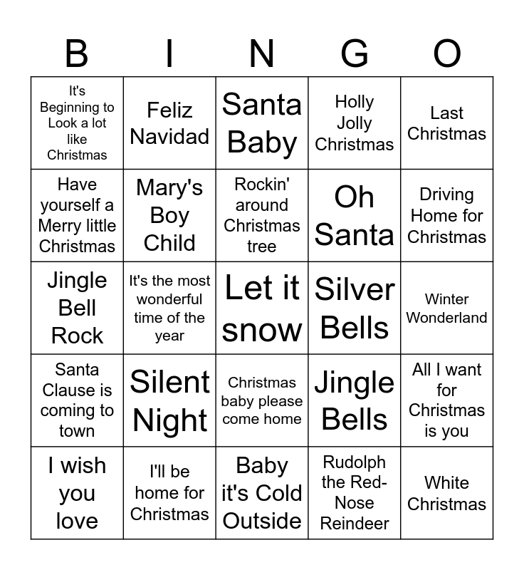 This bingo card has 25 words: Silent Night, Baby it's Cold Outside, Rockin' around Christmas tree, I wish you love, Last Christmas, It's Beginning to Look a lot like Christmas, Have yourself a Merry little Christmas, Feliz Navidad, Silver Bells, Christmas baby please come home, Oh Santa, Jingle Bell Rock, Jingle Bells, All I want for Christmas is you, Mary's Boy Child, White Christmas, Winter Wonderland, Santa Baby, Driving Home for Christmas, It's the most wonderful time of the year, Let it snow, I'll be home for Christmas, Santa Clause is coming to town, Holly Jolly Christmas and Rudolph the Red-Nose Reindeer.