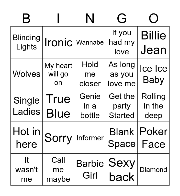 This bingo card has 25 words: Sorry, Barbie Girl, Hold me closer, It wasn't me, Billie Jean, Blinding Lights, Wolves, Ironic, Get the party Started, Informer, As long as you love me, Single Ladies, Blank Space, Poker Face, My heart will go on, Diamond, Rolling in the deep, Wannabe, Ice Ice Baby, True Blue, Genie in a bottle, Call me maybe, Hot in here, If you had my love and Sexy back.
