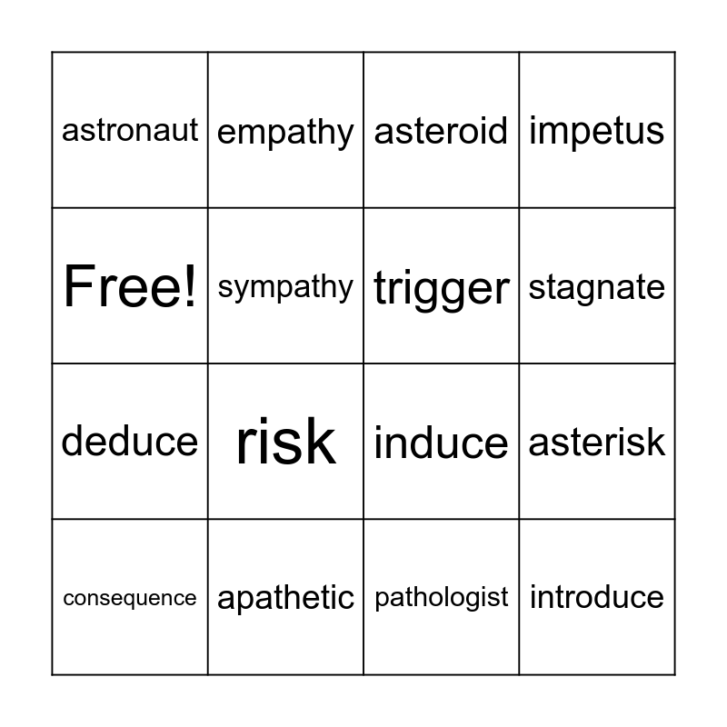 This bingo card has 16 words: apathetic, asterisk, asteroid, astronaut, deduce, empathy, induce, pathologist, Free!, sympathy, consequence, impetus, risk, stagnate, trigger and introduce.
