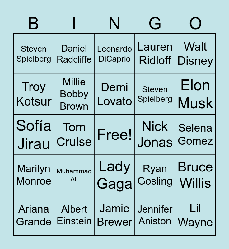 This bingo card has a free space and 30 words: Albert Einstein, Marlee Matin, Tom Cruise, Danny Glover, Steven Spielberg, Leonardo DiCaprio, Millie Bobby Brown, Lady Gaga, Nick Jonas, Jamie Brewer, Selena Gomez, Lil Wayne, Jennifer Aniston, Jim Carrey, Elon Musk, Peter Dinklage, Ryan Gosling, Marilyn Monroe, Muhammad Ali, Walt Disney, Sofía Jirau, Billie Eilish, Daniel Radcliffe, Steven Spielberg, Troy Kotsur, Lauren Ridloff, Bruce Willis, Ariana Grande, Demi Lovato and Adele.