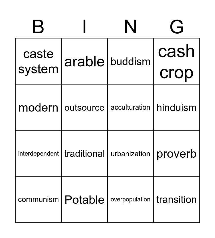 This bingo card has 16 words: Potable, proverb, buddism, caste system, interdependent, arable, urbanization, overpopulation, modern, outsource, communism, cash crop, traditional, hinduism, acculturation and transition.