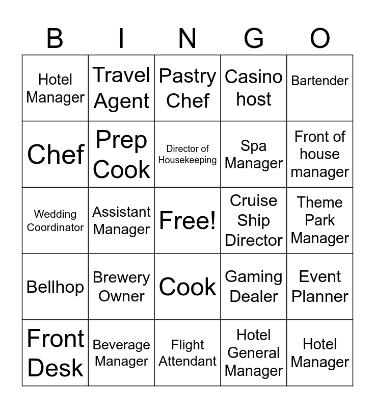 This bingo card has a free space and 24 words: Brewery Owner, Beverage Manager, Director of Housekeeping, Front Desk, Bartender, Hotel Manager, Chef, Travel Agent, Cruise Ship Director, Cook, Spa Manager, Wedding Coordinator, Gaming Dealer, Event Planner, Prep Cook, Hotel General Manager, Theme Park Manager, Pastry Chef, Front of house manager, Assistant Manager, Hotel Manager, Bellhop, Casino host and Flight Attendant.