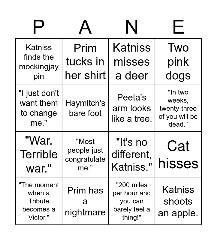 This bingo card has 16 words: Prim has a nightmare, Cat hisses, Katniss misses a deer, Katniss finds the mockingjay pin, "War. Terrible war.", Prim tucks in her shirt, "It's no different, Katniss.", "200 miles per hour and you can barely feel a thing!", "I just don't want them to change me.", Haymitch's bare foot, "The moment when a Tribute becomes a Victor.", Two pink dogs, "Most people just congratulate me.", "In two weeks, twenty-three of you will be dead.", Peeta's arm looks like a tree. and Katniss shoots an apple..