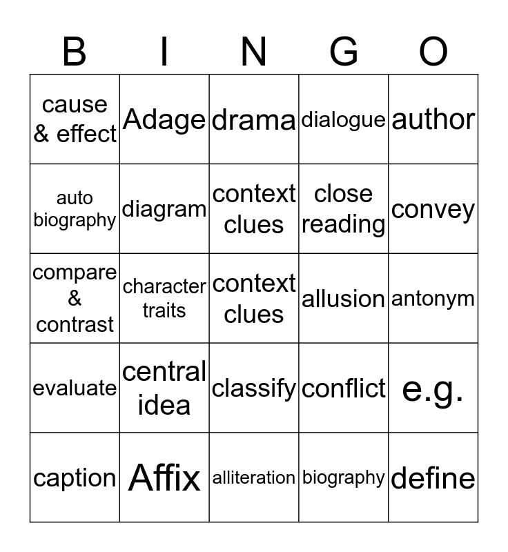 This bingo card has 25 words: central idea, alliteration, context clues, caption, author, cause & effect, auto biography, Adage, allusion, classify, close reading, compare & contrast, conflict, e.g., diagram, define, antonym, drama, convey, character traits, context clues, Affix, evaluate, dialogue and biography.
