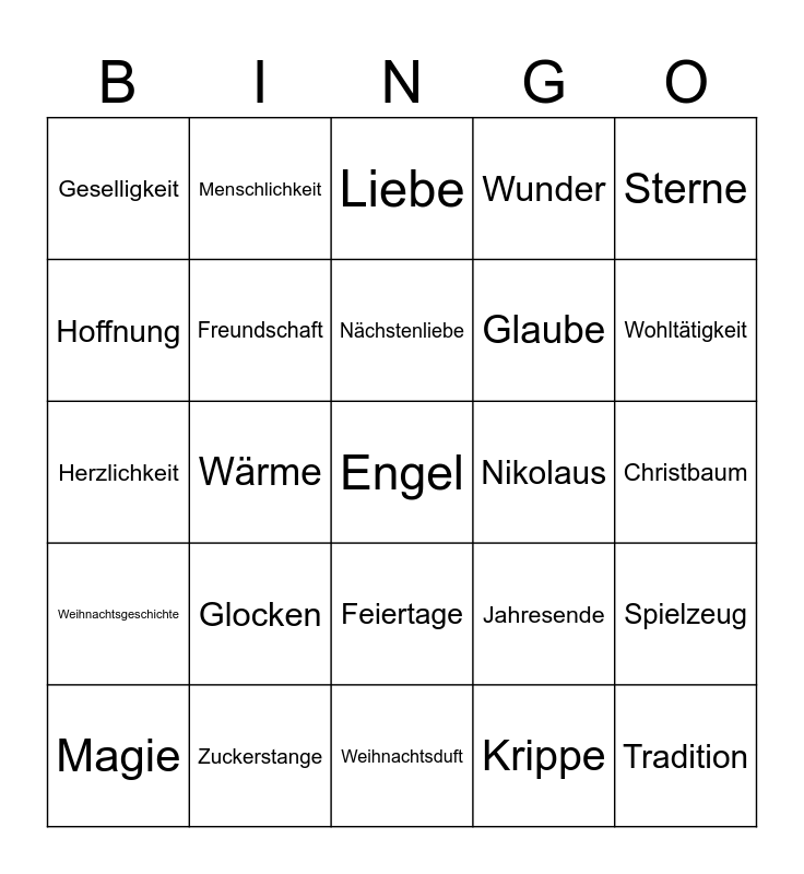 This bingo card has 75 words: Weihnachten, Frieden, Liebe, Familie, Freude, Geschenke, Harmonie, Zusammenhalt, Feiern, Fest, Tradition, Besinnlichkeit, Nächstenliebe, Hoffnung, Glück, Wärme, Geborgenheit, Engel, Licht, Sterne, Wünsche, Herzlichkeit, Freundschaft, Menschlichkeit, Wunder, Bescherung, Christkind, Gemeinschaft, Dankbarkeit, Heiligabend, Schnee, Winter, Rauhnächte, Jahresende, Wohltätigkeit, Glaube, Kirche, Stille, Christbaum, Krippe, Lieder, Gedichte, Geschichten, Vergebung, Zuhause, Festmahl, Magie, Geselligkeit, Erinnerungen, Besinnung, Helfen, Feiertage, Weihnachtsstimmung, Weihnachtsmann, Advent, Weihnachtsmarkt, Plätzchen, Frohsinn, Weihnachtslieder, Leuchten, Glocken, Punsch, Tannenbaum, Kaminfeuer, Weihnachtskarte, Nikolaus, Rute, Rentier, Schlitten, Spielzeug, Weihnachtsgeschichte, Zuckerstange, Schneeflocken, Weihnachtsduft and Glöckchen.