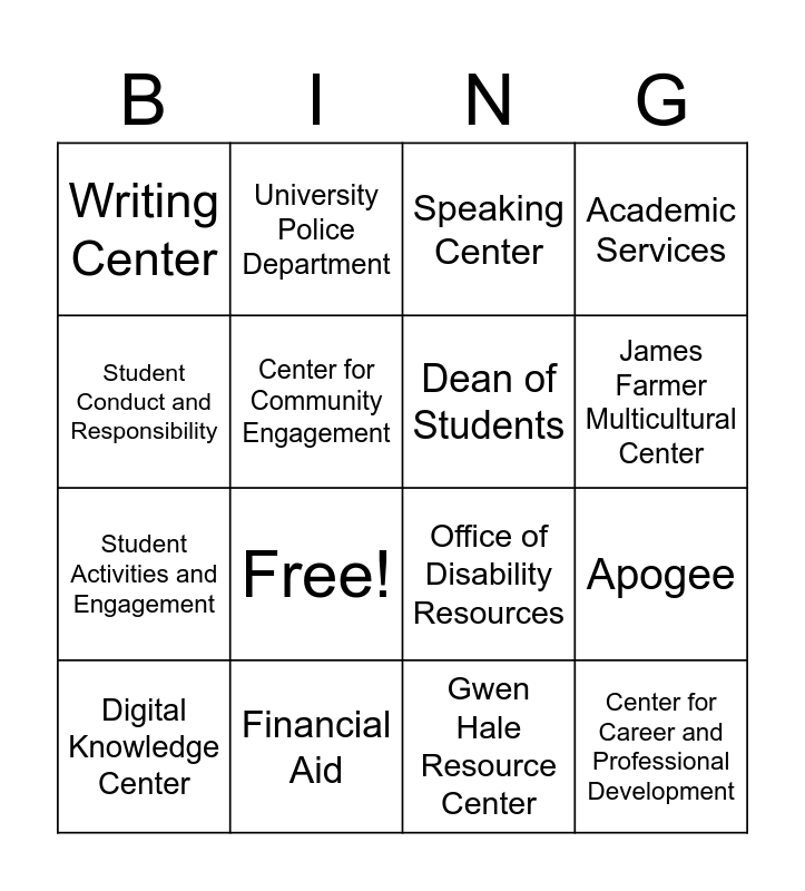 This bingo card has 18 words: Free!, Center for Career and Professional Development, Speaking Center, Writing Center, Office of Disability Resources, Academic Services, Digital Knowledge Center, University Police Department, James Farmer Multicultural Center, Student Activities and Engagement, Gwen Hale Resource Center, Student Conduct and Responsibility, Apogee, Center for Community Engagement, Dean of Students, Residence Life and Housing, Financial Aid and Parking Management.