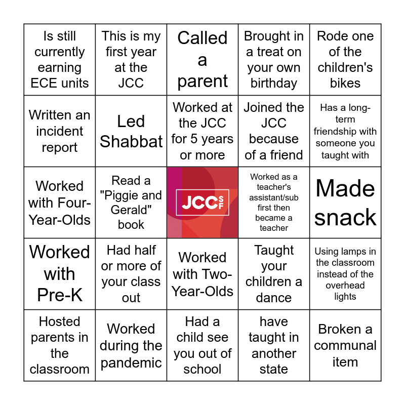 This bingo card has a free space and 92 words: Enjoys spicy food, Successfully worked with parents on behavior, Had a child see you out of school, Speak more than one language, Are a San Francisco Native, Lost your keycard, Celebrated Purim at school, Hosted parents in the classroom, Were born outside of the USA, Dropped food meant for children, Forgot your lunch, Were born outside of CA, Changed a diaper, Joined the JCC because of a friend, Babysat a child, Rode one of the children's bikes, Called a parent, Wore a costume, Called a child the wrong name, Had a child forget your name, Try skydiving, Cooked with your class, Got sneezed on, Wore pajamas to work, Had half or more of your class out, Led Shabbat, Led Havdalah, Participated in a fire drill, Took your walkie talkie home, Worked at the JCC for 10 years or more, Worked during the pandemic, Worked with Two-Year-Olds, Worked with Two-and-a-Half Year Olds, Worked with Three-Year-Olds, This is my first year at the JCC, Enjoys poetry, Written a newsletter, Been late to work, Worked at the JCC for 5 years or more, Taught your children a dance, Worked with Four-Year-Olds, Worked with Pre-K, Made snack, Visited another Reggio school, Broken a communal item, Changed the toner, Called Xantrion, Performed during Family Shabbat, Read "The Very Hungry Caterpillar", Emailed a parent, Written documentation, Had a parent react to a newsletter, Had a student that spoke no English, Changed a child's clothes, Played on the structure, Had kid's music on your Spotify Wrapped/Apple Music Replay, Read "Caps for Sale", Written an incident report, Read a "Pete the Cat" book, Read a "Piggie and Gerald" book, Had a child call you "Mom" or "Dad", Had a child show up after 10am without notice, Used "Bear Hunt" as a movement song, Had a child refuse to nap, First year teacher, have taught in another state, Keeps personal snacks / candies in teacher area, Has a family photo of their own in the classroom, Has had a class pet, Has done yoga / an exercise with the kids, Can name every parent in the school, Has gone to a birthday party for a student, Brought in a treat on your own birthday, First time getting to know Reggio-Emilia, Over 5 years of practicing a Reggio-Emilia, Has created a sculpture using loose parts, Using lamps in the classroom instead of the overhead lights, Has a preferred nap time playlist/ sounds to play, Has made an obstacle course for the children, Studied child development to become a teacher, Has always wanted to be a teacher, Worked as a teacher's assistant/sub first then became a teacher, Is still currently earning ECE units, Has completed up to 24 units of ECE, Has performed a puppet show with your co-teacher, Used your lunch break to go run an errand, Has had to the power go out at school, Played in the rain with the kids, Babysitting was your first job, Watched a movie more than once, Has a long-term friendship with someone you taught with and Brought in a family member or spouse to introduce to the kids.