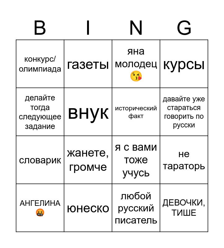 This bingo card has 16 words: юнеско, не тараторь, яна молодец 😘, конкурс/олимпиада, словарик, газеты, я с вами тоже учусь, любой русский писатель, делайте тогда следующее задание, внук, АНГЕЛИНА 🤬, курсы, жанете, громче, давайте уже стараться говорить по русски, исторический факт and ДЕВОЧКИ, ТИШЕ.