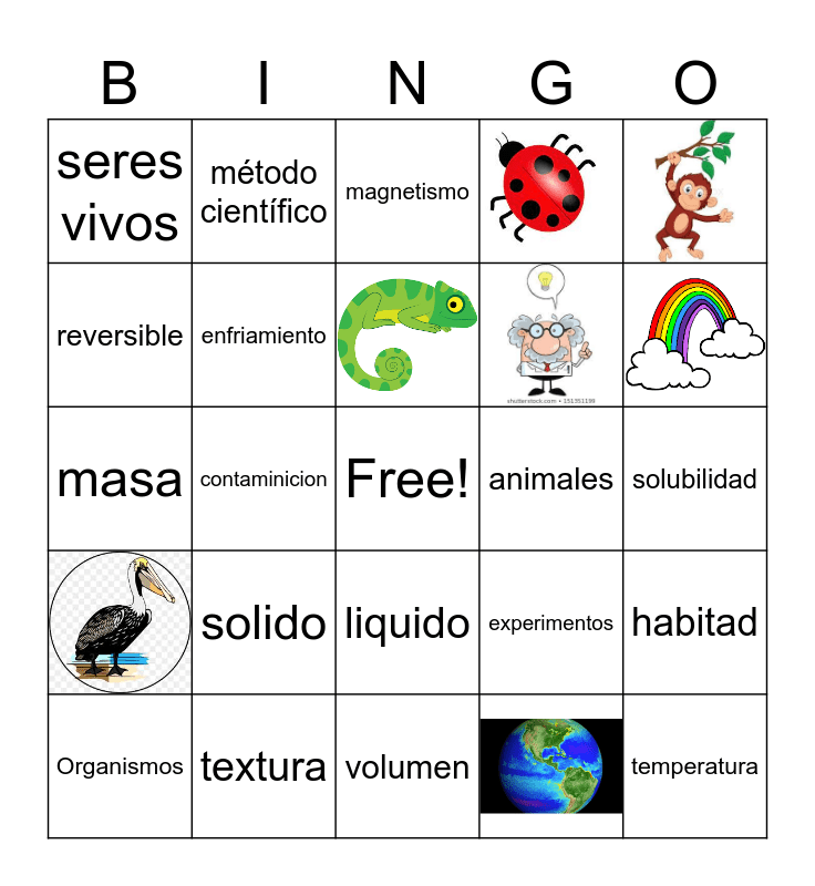This bingo card has 8 images, a free space and 21 words: Organismos, propiedades de la materia, contaminicion, cambio climatico, seres vivos, magnetismo, enfriamiento, solido, animales, textura, solubilidad, temperatura, volumen, irreversibles, liquido, masa, experimentos, gaseoso, reversible, método científico and habitad.