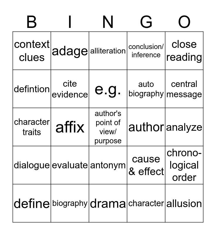This bingo card has 25 words: evaluate, drama, e.g., define, close reading, context clues, defintion, adage, author, antonym, auto biography, character traits, cause & effect, chrono- logical order, cite evidence, allusion, analyze, alliteration, central message, affix, author's point of view/ purpose, biography, dialogue, conclusion/ inference and character.