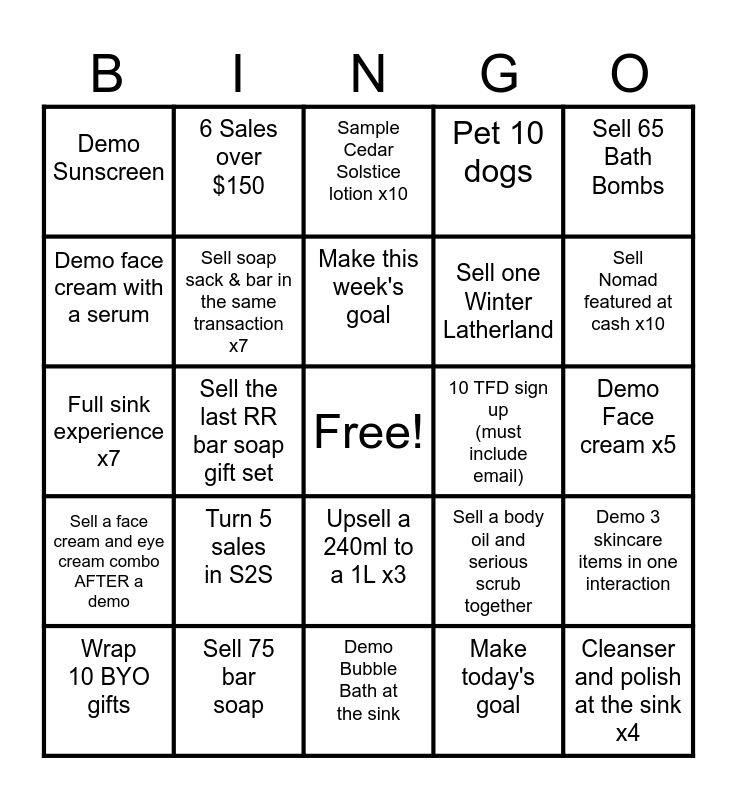 This bingo card has a free space and 24 words: Turn 5 sales in S2S, Sell 75 bar soap, Make this week's goal, Wrap 10 BYO gifts, Sell 65 Bath Bombs, Demo Sunscreen, Demo face cream with a serum, 6 Sales over $150, 10 TFD sign up (must include email), Upsell a 240ml to a 1L x3, Sell one Winter Latherland, Full sink experience x7, Sell a body oil and serious scrub together, Demo 3 skincare items in one interaction, Sell soap sack & bar in the same transaction x7, Make today's goal, Demo Face cream x5, Sample Cedar Solstice lotion x10, Sell Nomad featured at cash x10, Sell the last RR bar soap gift set, Cleanser and polish at the sink x4, Sell a face cream and eye cream combo AFTER a demo, Pet 10 dogs and Demo Bubble Bath at the sink.