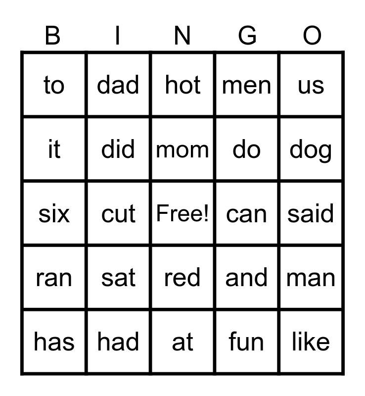 This bingo card has a free space and 52 words: am, like, the, at, sat, see, dad, if, it, sit, did, in, man, and, on, not, mom, can, up, us, cut, fun, to, do, bat, but, big, got, dog, bed, ten, men, get, set, him, hot, had, his, is, look, into, said, ran, run, red, let, yes, six, box, its, has and sees.