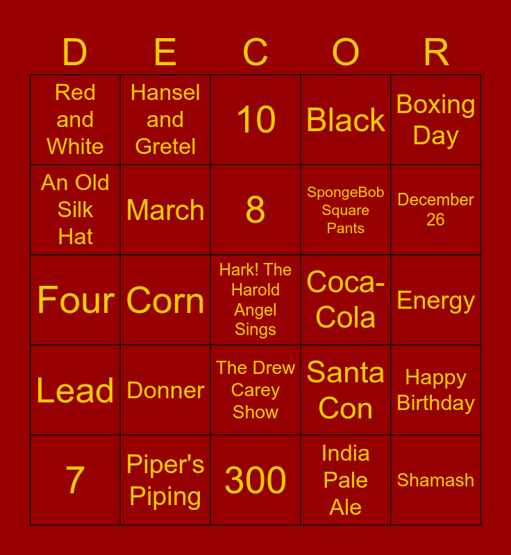 This bingo card has a free space and 24 words: Donner, Piper's Piping, 8, 7, Boxing Day, Red and White, An Old Silk Hat, Hansel and Gretel, Coca-Cola, The Drew Carey Show, SpongeBob Square Pants, Four, Santa Con, Happy Birthday, March, India Pale Ale, Energy, 10, December 26, Corn, Shamash, Lead, Black and 300.