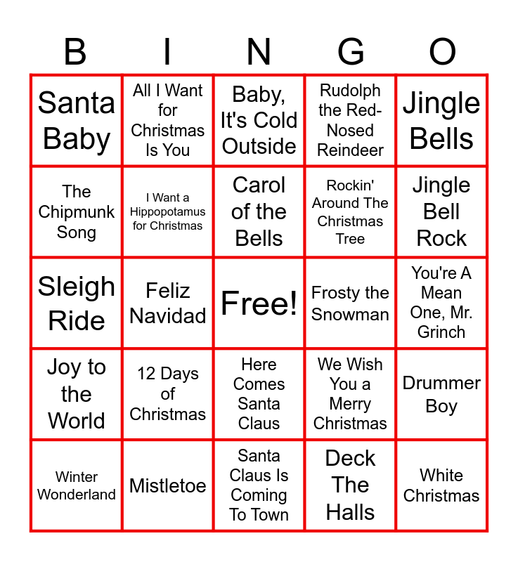 This bingo card has a free space and 24 words: 12 Days of Christmas, Mistletoe, Carol of the Bells, Winter Wonderland, Jingle Bells, Santa Baby, The Chipmunk Song, All I Want for Christmas Is You, Frosty the Snowman, Here Comes Santa Claus, Rockin' Around The Christmas Tree, Sleigh Ride, We Wish You a Merry Christmas, Drummer Boy, I Want a Hippopotamus for Christmas, Deck The Halls, You're A Mean One, Mr. Grinch, Baby, It's Cold Outside, Jingle Bell Rock, Feliz Navidad, White Christmas, Joy to the World, Rudolph the Red-Nosed Reindeer and Santa Claus Is Coming To Town.