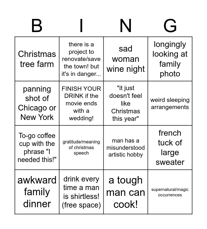 This bingo card has 27 words: woman is a journalist/baker/real estate/event planner, sassy best friend pep talk, To-go coffee cup with the phrase "I needed this!", infinity scarf, FINISH YOUR DRINK if the movie ends with a wedding!, sad woman wine night, there is a project to renovate/save the town! but it's in danger..., supernatural/magic occurrences, drink every time a man is shirtless! (free space), christmas knick knack shop, man has a misunderstood artistic hobby, longingly looking at family photo, woman is chilly and hugs herself with a long scarf or shawl around her shoulders, dead mom or dad, gratitude/meaning of christmas speech, loveable dog, "it just doesn't feel like Christmas this year", weird sleeping arrangements, it's clearly summer when they shot this movie, Christmas tree farm, a tough man can cook!, flour romantically streaked on cheek/food fight, french tuck of large sweater, awkward family dinner, narrator voiceover directed at audience, panning shot of Chicago or New York and cocoa mustache.