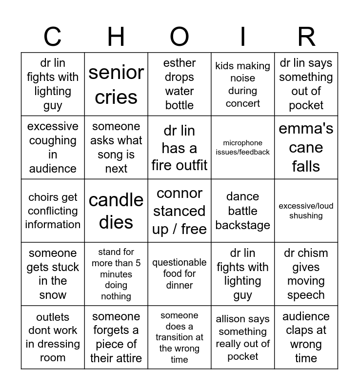 This bingo card has a free space and 29 words: outlets dont work in dressing room, someone misplaces candle, candle dies, a bass is late, dr lin fights with lighting guy, esther drops water bottle, someone asks what song is next, stand for more than 5 minutes doing nothing, dance battle backstage, someone forgets a piece of their attire, excessive/loud shushing, audience claps at wrong time, someone does a transition at the wrong time, allison says something really out of pocket, emma's cane falls, someone forgets choreography, questionable food for dinner, someone gets stuck in the snow, dr lin says something out of pocket, choirs get conflicting information, dr lin fights with lighting guy, dr lin fights with lighting guy, microphone issues/feedback, excessive coughing in audience, kids making noise during concert, senior cries, dr chism gives moving speech, dr lin has a fire outfit and wardrobe malfunction.