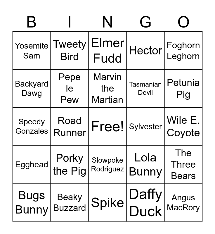 This bingo card has a free space and 24 words: Bugs Bunny, Porky the Pig, Marvin the Martian, Daffy Duck, Foghorn Leghorn, Yosemite Sam, Tweety Bird, Elmer Fudd, Sylvester, Wile E. Coyote, Speedy Gonzales, Pepe le Pew, Lola Bunny, The Three Bears, Backyard Dawg, Beaky Buzzard, Spike, Hector, Petunia Pig, Egghead, Road Runner, Slowpoke Rodriguez, Tasmanian Devil and Angus MacRory.