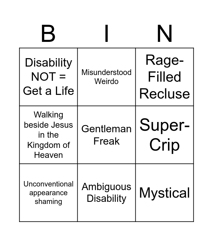 This bingo card has 12 words: Free!, Mystical, Gentleman Freak, Super-Crip, Misunderstood Weirdo, Rage-Filled Recluse, Ambiguous Disability, God-Given Disability, Disability NOT = Get a Life, Walking beside Jesus in the Kingdom of Heaven, Unconventional appearance shaming and A normal intellect.
