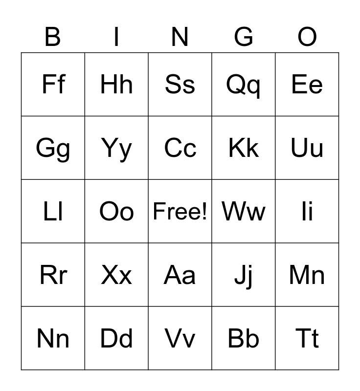 This bingo card has a free space and 26 words: Aa, Bb, Cc, Dd, Ee, Ff, Gg, Hh, Ii, Jj, Kk, Ll, Mn, Nn, Oo, Pp, Qq, Rr, Ss, Tt, Uu, Vv, Ww, Xx, Yy and Zz.
