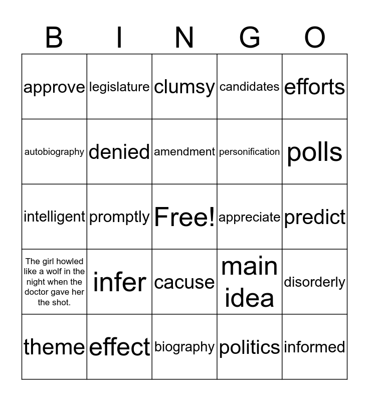 This bingo card has a free space and 24 words: infer, effect, amendment, theme, efforts, approve, autobiography, legislature, appreciate, cacuse, personification, intelligent, main idea, disorderly, denied, politics, predict, clumsy, polls, promptly, informed, The girl howled like a wolf in the night when the doctor gave her the shot., candidates and biography.