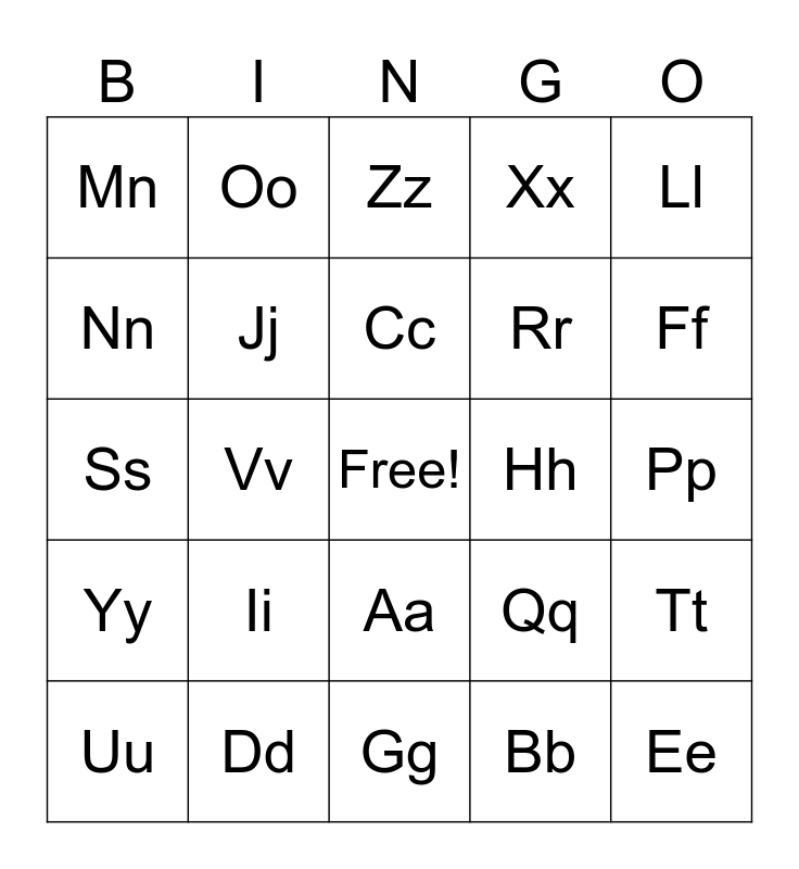 This bingo card has a free space and 26 words: Aa, Bb, Cc, Dd, Ll, Mn, Nn, Oo, Pp, Qq, Rr, Ss, Tt, Uu, Vv, Ww, Xx, Yy, Zz, Ee, Ff, Gg, Hh, Ii, Jj and Kk.