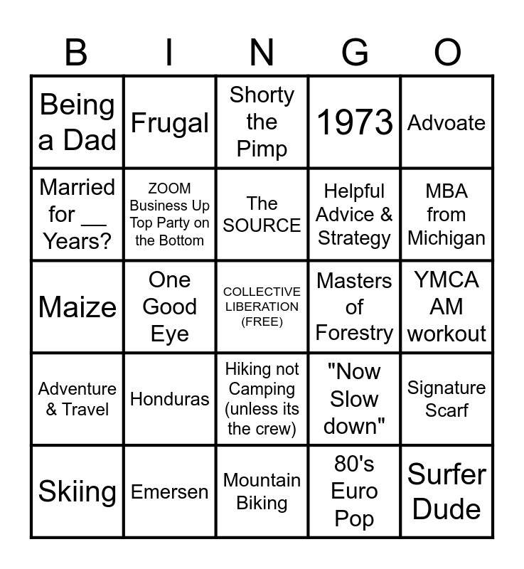 This bingo card has a free space and 29 words: Salmon Pants, Emersen, Shorty the Pimp, U of M Football, Advoate, Being a Dad, ZOOM Business Up Top Party on the Bottom, The SOURCE, Masters of Forestry, Signature Scarf, Skiing, One Good Eye, 80's Euro Pop, Surfer Dude, Maize, Amazing Writer, Mountain Biking, "Now Slow down", MBA from Michigan, Adventure & Travel, Honduras, Bandana, Helpful Advice & Strategy, YMCA AM workout, Married for __ Years?, Frugal, Hiking not Camping (unless its the crew), 1973 and Sagittarius.
