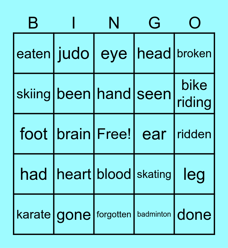 This bingo card has a free space and 41 words: arm, foot, neck, been, gone, blood, hand, nose, broken, had, brain, head, done, ridden, ear, heart, skin, eaten, run, eye, leg, stomach, forgotten, seen, taken, won, badminton, basketball, bike riding, golf, gymnastics, judo, karate, running, skating, skiing, soccer, surfing, swimming, tennis and yoga.