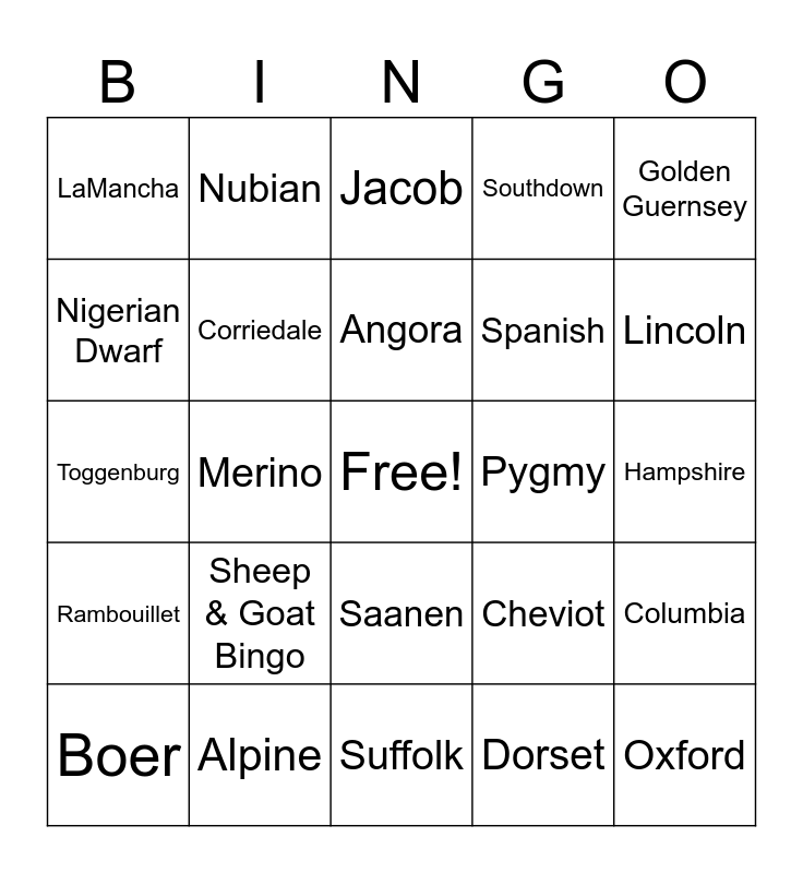 This bingo card has a free space and 24 words: Sheep & Goat Bingo, Alpine, Angora, Boer, Golden Guernsey, LaMancha, Nigerian Dwarf, Nubian, Pygmy, Saanen, Spanish, Toggenburg, Cheviot, Columbia, Corriedale, Dorset, Hampshire, Jacob, Lincoln, Merino, Oxford, Rambouillet, Southdown and Suffolk.