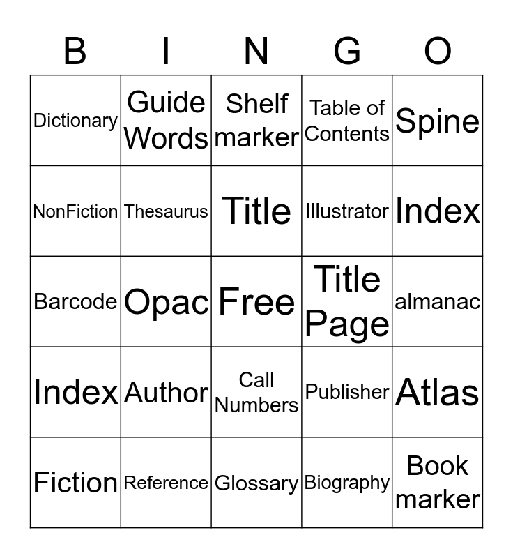 This bingo card has a free space and 24 words: Author, Reference, Title, Fiction, Spine, Dictionary, NonFiction, Guide Words, Title Page, Call Numbers, Illustrator, Barcode, Publisher, Atlas, Thesaurus, Biography, almanac, Shelf marker, Index, Opac, Book marker, Index, Table of Contents and Glossary.