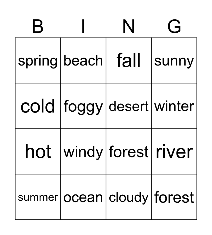 This bingo card has 16 words: ocean, river, fall, spring, hot, beach, forest, cloudy, cold, foggy, summer, sunny, windy, winter, desert and forest.
