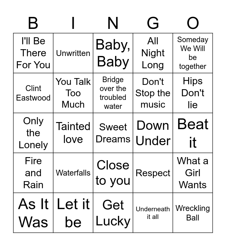 This bingo card has 40 words: What A Wonderful World, Only the Lonely, Beyond the Sea, You Talk Too Much, Let it be, Close to you, Bridge over the troubled water, Ain't No Mountain High Enough, Someday We Will be together, Fire and Rain, Tainted love, All Night Long, Sweet Dreams, Beat it, Down Under, Waterfalls, Livin' La Vida Loca, I'll Be There For You, Always Be My Baby, Baby, Baby, What a Girl Wants, Underneath it all, Don't Stop the music, Clint Eastwood, My Happy Ending, The Lazy Song, Can't Feel My Face, Some Nights, Wreckling Ball, Shut Up and Dance, Looking For Somebody (To Love), As It Was, Leave the door open, Respect, Hips Don't lie, Get Lucky, Don't You Want Me, She drives me crazy, Unwritten and California Dreamin'.