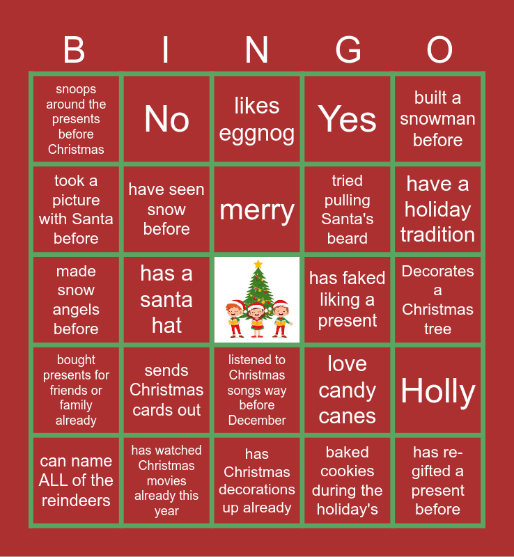 This bingo card has a free space and 29 words: can name ALL of the reindeers, owns an ugly Christmas sweater, has a santa hat, built a gingerbread house, snoops around the presents before Christmas, likes eggnog, have seen snow before, sends Christmas cards out, has faked liking a present, has watched Christmas movies already this year, Decorates a Christmas tree, has re-gifted a present before, has Christmas decorations up already, baked cookies during the holiday's, have a holiday tradition, watched all three home alone movies, listened to Christmas songs way before December, bought presents for friends or family already, built a snowman before, made snow angels before, love candy canes, owns an advent calendar, tried pulling Santa's beard, took a picture with Santa before, Yes, No, Holly, merry and jolly.