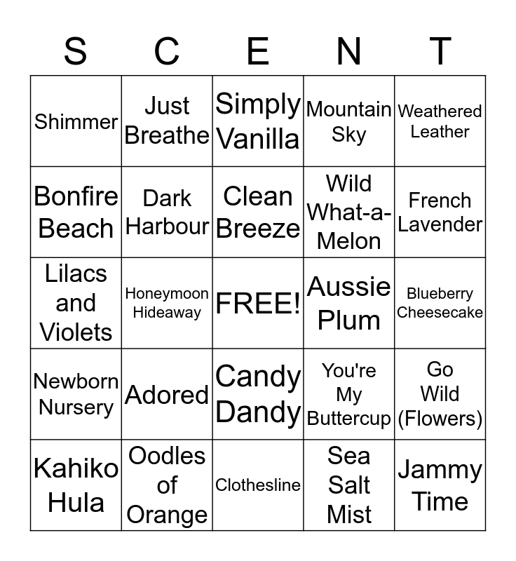 This bingo card has a free space and 24 words: Adored, Oodles of Orange, Clean Breeze, Kahiko Hula, Weathered Leather, Shimmer, Bonfire Beach, Just Breathe, Aussie Plum, Candy Dandy, Wild What-a- Melon, Lilacs and Violets, You're My Buttercup, Go Wild (Flowers), Dark Harbour, Sea Salt Mist, Blueberry Cheesecake, Simply Vanilla, French Lavender, Honeymoon Hideaway, Jammy Time, Newborn Nursery, Mountain Sky and Clothesline.