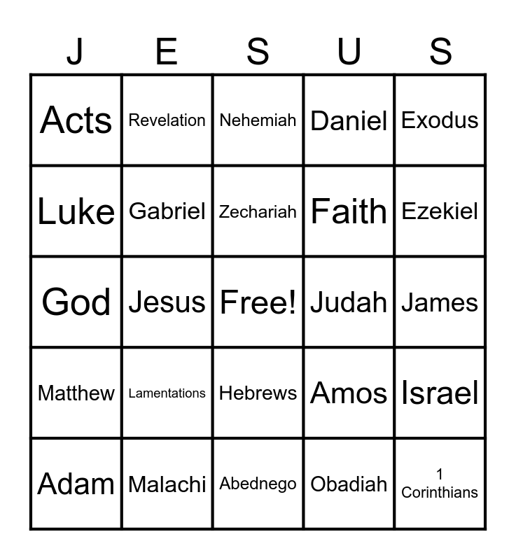 This bingo card has a free space and 104 words: Old Testament, Genesis, Exodus, Leviticus, Numbers, Deuteronomy, Joshua, Judges, Ruth, 1 Samuel, 2 Samuel, 1 Kings, 2 Kings, 1 Chronicles, 2 Chronicles, Ezra, Nehemiah, Esther, Job, Psalms, Proverbs, Ecclesiastes, Songs of Songs, Isaiah, Jeremiah, Lamentations, Ezekiel, Daniel, Hosea, Joel, Amos, Obadiah, Jonah, Micah, Nahum, Habakkuk, Zephaniah, Haggai, Zechariah, Malachi, New Testament, Matthew, Mark, Luke, John, Acts, Romans, 1 Corinthians, 2 Corinthians, Galatians, Ephesians, Philippians, Colossians, 1 Thessalonians, 2 Thessalonians, 1 Timothy, 2 Timothy, Titus, Philemon, Hebrews, James, 1 Peter, 2 Peter, 1 John, 2 John, 3 John, Jude, Revelation, God, Jesus, Abednego, Mary, Abraham, Joseph, Paul, Goliath, Peter, Adam, Eve, David, Elijah, Enoch, Gabriel, John the Baptist, Judah, Jude, Moses, Noah, Nazareth, Bethlehem, Galilee, Jerusalem, Heaven, Israel, Angel, Holy Spirit, Sin, Faith, Hope, Love, Thomas, Solomon, Seth and Judah.