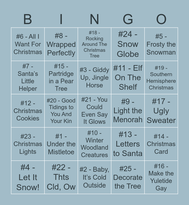 This bingo card has 25 words: #1 - Under the Mistletoe, #2 - Baby, It’s Cold Outside, #3 - Giddy Up, Jingle Horse, #4 - Let It Snow!, #5 - Frosty the Snowman, #6 - All I Want For Christmas, #7 - Santa’s Little Helper, #8 - Wrapped Perfectly, #9 - Light the Menorah, #10 - Winter Woodland Creatures, #11 - Elf On The Shelf, #12 - Christmas Cookies, #13 - Letters to Santa, #14 - Christmas Card, #15 - Partridge in a Pear Tree, #16 - Make the Yuletide Gay, #17 - Ugly Sweater, #18 - Rocking Around The Christmas Tree, #19 - Southern Hemisphere Christmas, #20 - Good Tidings to You And Your Kin, #21 - You Could Even Say It Glows, #22 - Thts Cld, Ow, #23 - Christmas Lights, #24 - Snow Globe and #25 - Decorate the Tree.
