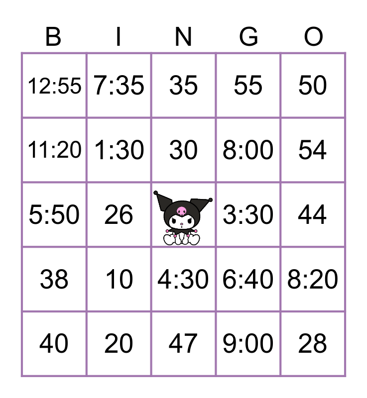 This bingo card has a free space and 24 words: 10, 20, 30, 40, 50, 12:55, 11:20, 7:35, 3:30, 4:30, 8:00, 5:50, 6:40, 8:20, 1:30, 9:00, 44, 35, 54, 26, 28, 38, 55 and 47.